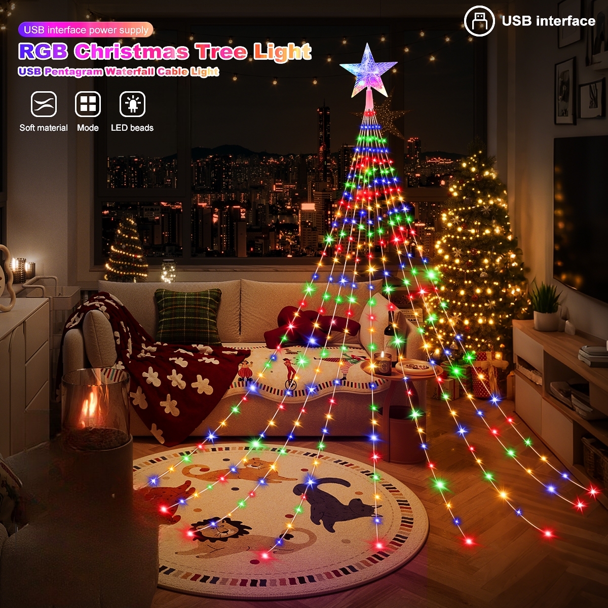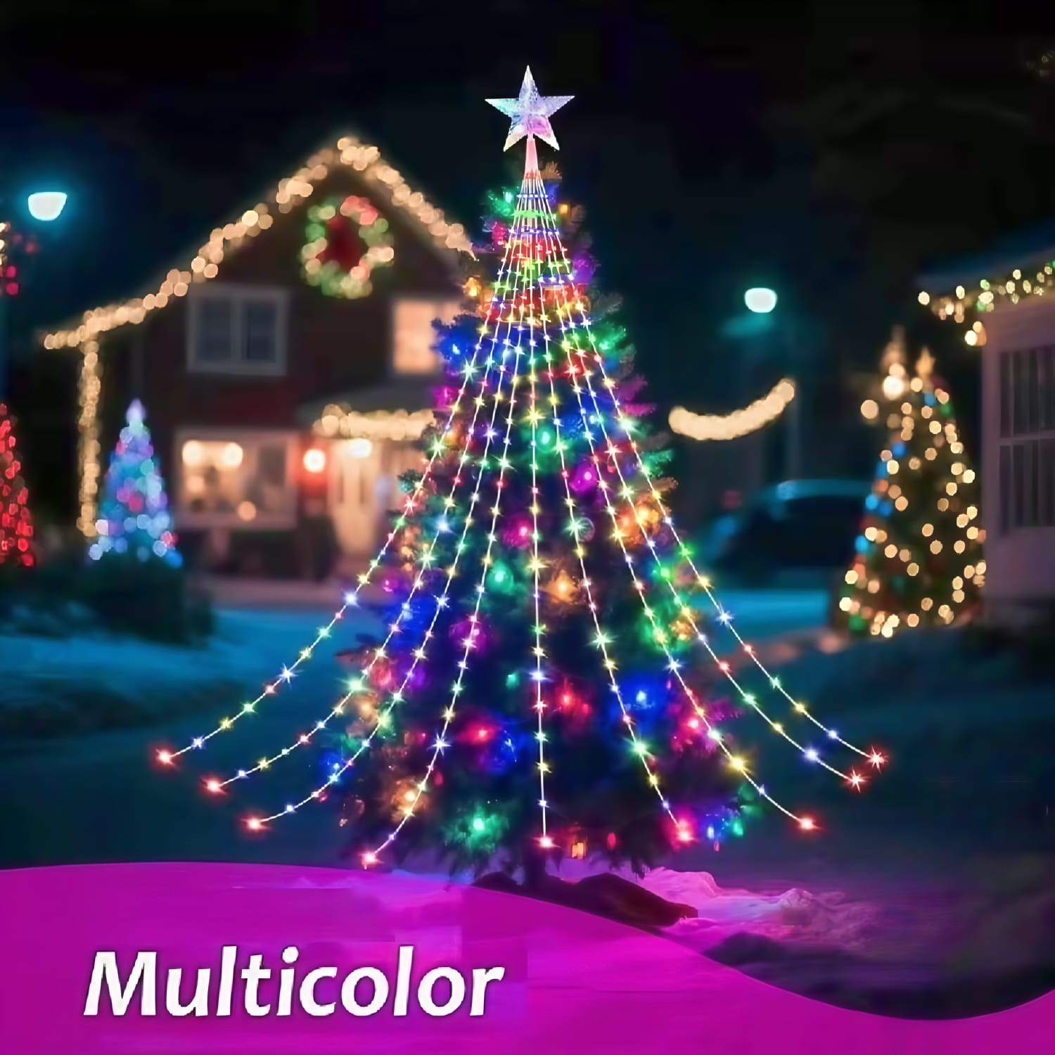 Con nueve tiras que caen elegantemente desde la estrella, cada una de 2 metros de longitud, esta cortina crea un efecto visual mágico que recuerda a un árbol iluminado. La luz multicolor que emite aporta un ambiente navideño y festivo, ideal para las fiestas de fin de año.