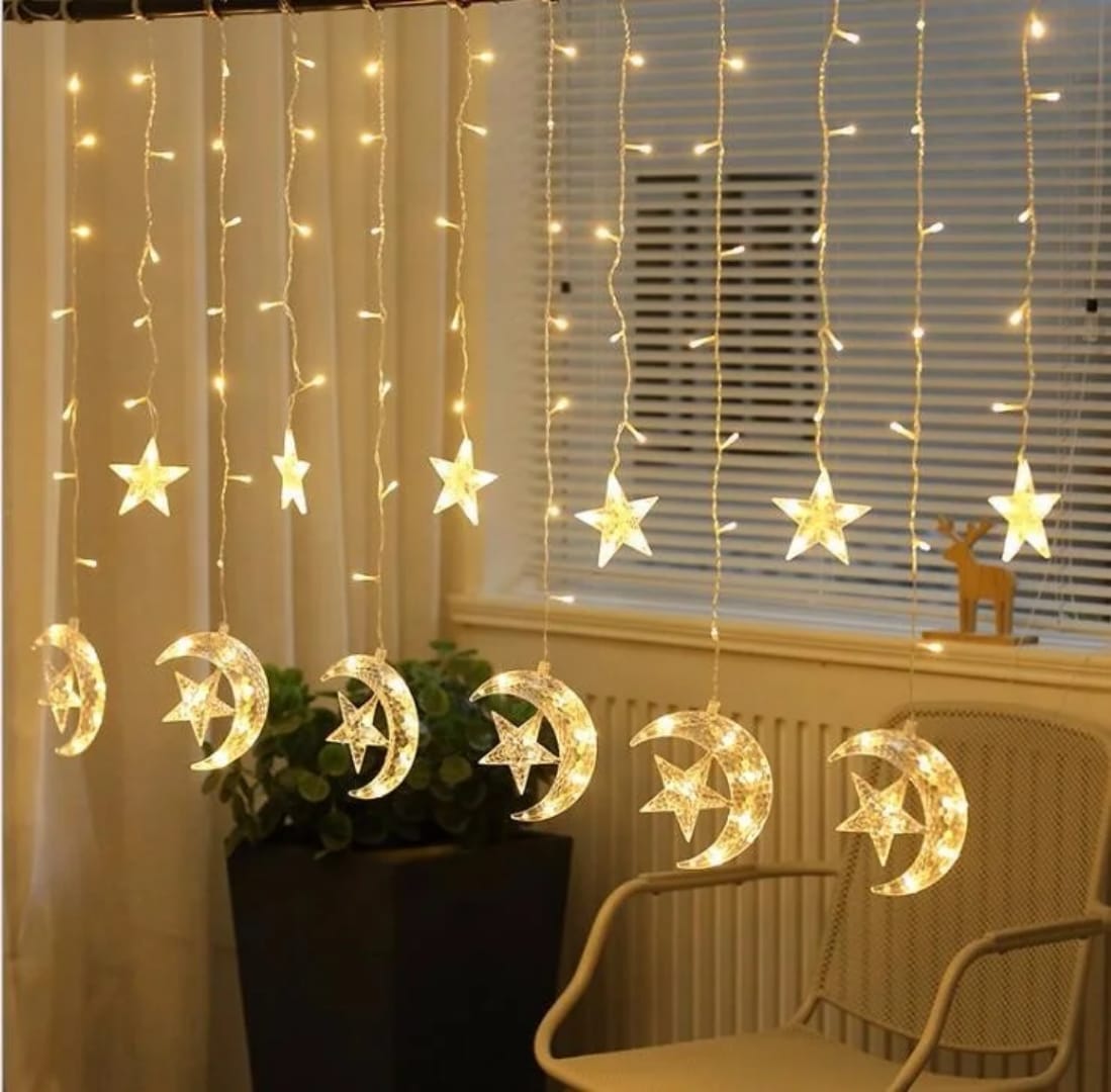 Transforma tu espacio en un paisaje cálido y encantador con nuestra Cortina Cascada con 6 medias lunas y 6 Estrellas pequeñas colgantes. Este hermoso adorno presenta un diseño festivo que combina media lunas y estrellas, creando un efecto visual mágico y acogedor. Ideal para decorar durante la temporada navideña o para eventos especiales